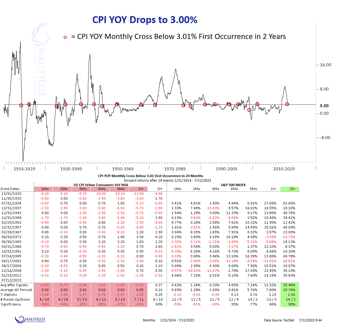 Históricamente, y hablamos de más de un siglo en Estados Unidos, cuando la inflación ha declinado por debajo del 3,1% por primera vez en el último año, eso ha sido un factor muy positivo para el mercado de acciones, habiéndose apreciado el S&P 500 un año después en el 90% de las ocasiones.
