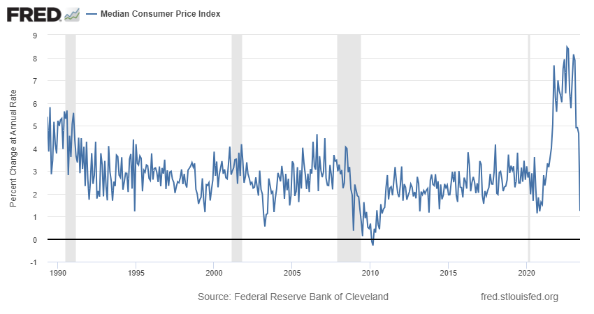 Un ejemplo de esto lo tenemos en la mediana de la inflación según el cálculo de la Reserva Federal de Cleveland. La mediana es interesante para entender la tendencia subyacente, ya que por definición excluye las lecturas elevadas y bajas de los diferentes componentes de la inflación y, simplemente se centra en las que están en la mitad. Lo llamativo de este dato es que la inflación mediana ha colapsado en junio hasta el 1,23% anualizado, cuando venía de un 4,65% anualizado en el mes anterior.