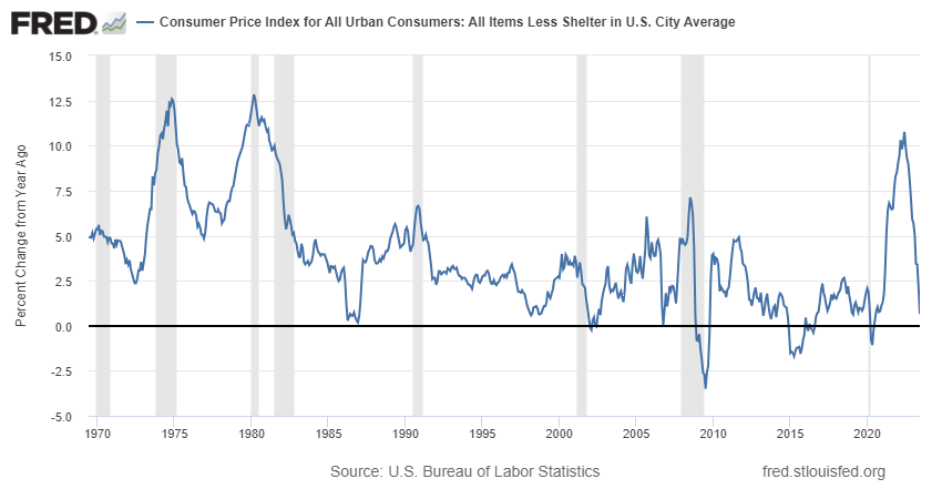 Observadas las cosas de esta manera, excluyendo la inflación inmobiliaria, vemos que la inflación interanual se ha moderado fuertemente hasta el 0,7%, una lectura completamente dentro del rango normal de lo visto durante las últimas décadas.