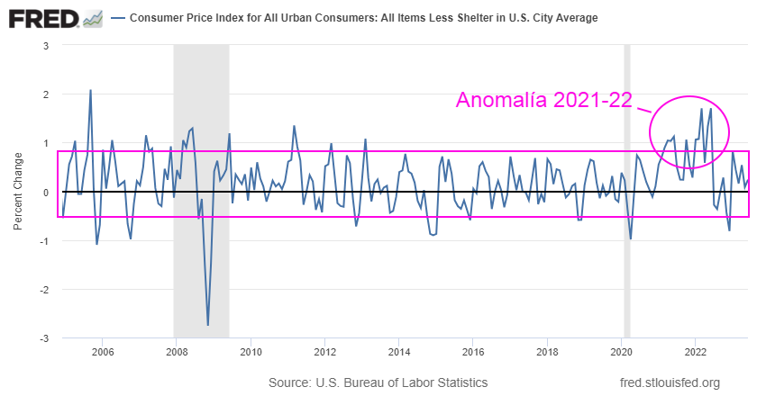 Por ejemplo, una de las series más relevantes que seguimos es la de la inflación excluyendo la inflación inmobiliaria, habida cuenta que es un hecho reconocido por todos que el segmento inmobiliario del cálculo de la inflación general, es tremendamente retrasado con respecto a la realidad.