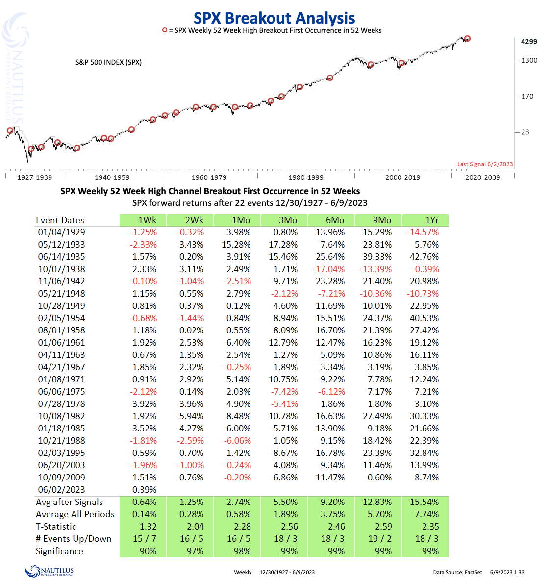 Desde 1927, como ilustra Nautilus Research en la siguiente imagen, una vez que el mercado rompe máximos anuales por primera vez en un año, el fuerte momentum alcista ha continuado ofreciendo rentabilidades positivas un año después en el 86% de los casos (18 de 21 casos). Y de los tres casos donde las rentabilidades a un año fueron negativas, hablamos de caídas del -14,57% (1930), del -0,39% (1939) y del -10,73% (1949). Momentum alcista llama a momentum alcista y es poco probable grandes caídas desde este punto (si la historia es buena guía).