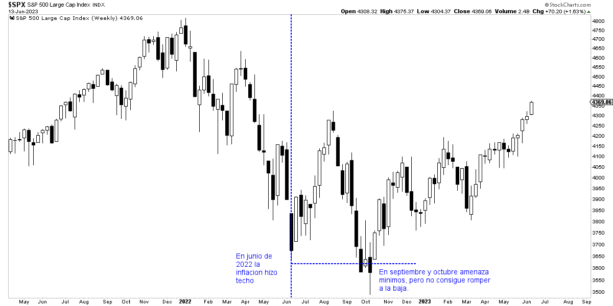 Así, en junio de 2022 el mercado intentó formar un suelo justo cuando la inflación hacía techo (dato de inflación de junio que se conoció en julio de 2022), para luego formar un clásico "retest" de mínimos en octubre del mismo año y que fue el mínimo absoluto del mercado bajista previo.