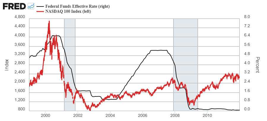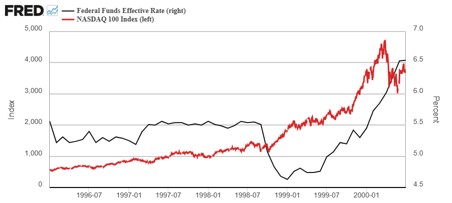 Uno es el que muestra el siguiente gráfico, donde la FED recortó los tipos de interés oficiales en la segunda mitad de 1998 y, tras un breve periodo de turbulencias bursátiles, el mercado de acciones siguió repuntando al alza con inusitada fuerza.