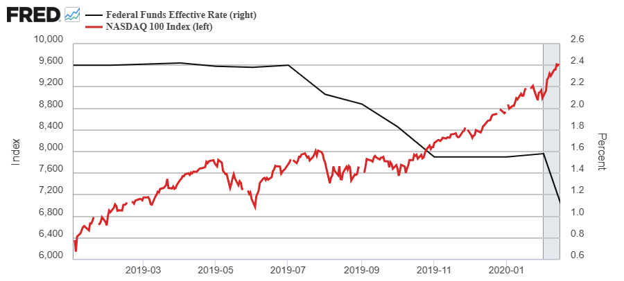 O, en un ejemplo más reciente pero breve porque fue casi inmediatamente interrumpido por los acontecimientos de la pandemia, vemos como el ciclo de recortes de tipos de interés iniciado a mediado de 2019, no provocó caídas bursátiles, sino más bien lo contrario, los mercados continuaron con sus ascensos, simple y llanamente porque no se estaba en una situación de recesión económica.