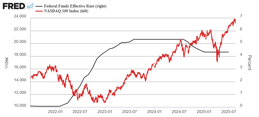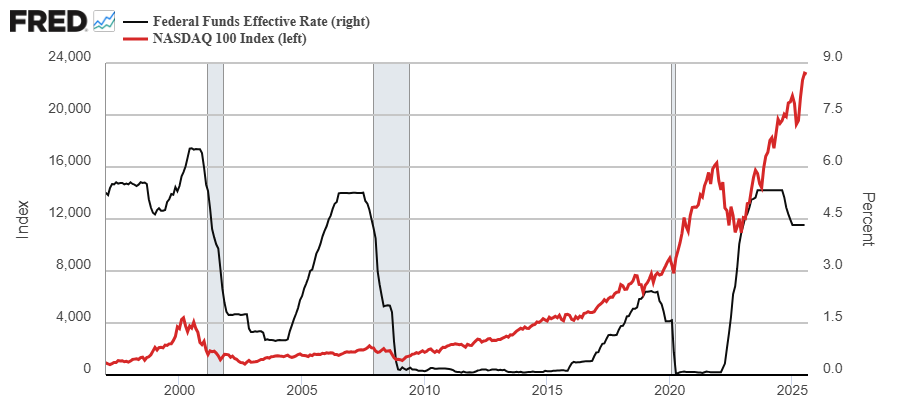 O, en un ejemplo aún más reciente, vemos como el recorte de tipos de interés iniciado por la FED a finales de 2024, no fue un factor bajista para el mercado de acciones, el cual siguió apreciándose hasta febrero de 2025, fecha en la que dejó de subir por otros factores que comentamos aquí en su momento (la guerra arancelaria de Trump y su interés en crear un "growth scare").