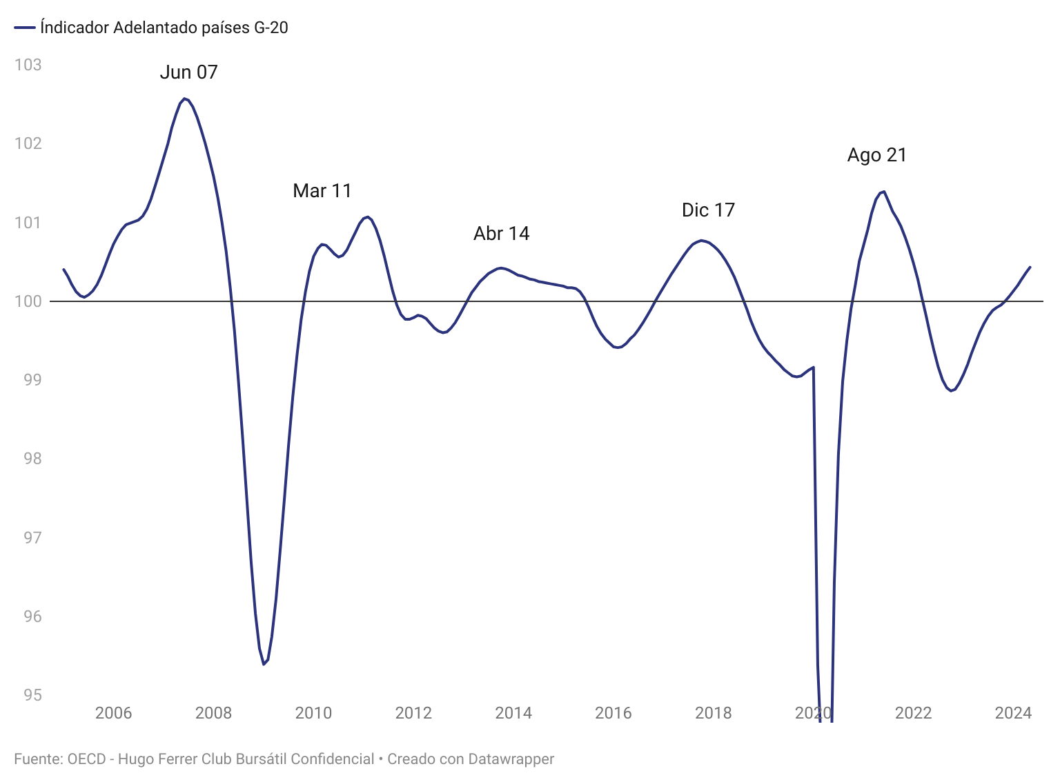 El indicador adelantado de la OCDE para el G-20 ha seguido subiendo hasta el mes de junio (último dato conocido), pero en agosto la OCDE no publica datos por ser verano y hay que estar muy atentos a la lectura que ofrezca el próximo 5 de septiembre, ya que podría traer sorpresas.