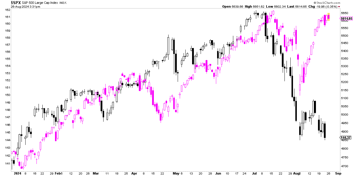 No obstante, sobre el caso actual de la relativamente potente corrección experimentada en agosto, y ya con la calma que da el paso del tiempo y el que los mercados han rebotado con fuerza, me reafirmo en los comentarios que hice el pasado día 7 en el artículo "Esto es una corrección bursátil en medio de un mercado alcista": la gran clave del momento actual es el giro del foco de la FED desde la inflación al empleo y lo del carry trade sobre el yen sólo ha sido un coadyuvante o acelerador de las caídas, nada más.