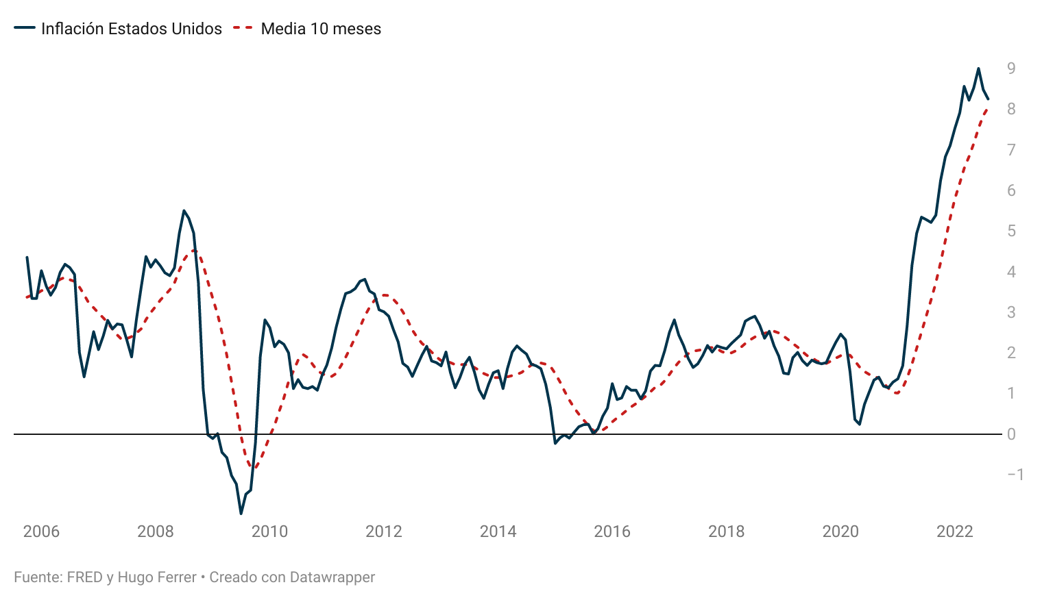 Así que, ahora, con la señal técnica ya desactivada, y teniendo en cuenta que la señal macro (en este caso la inflación) aún no se ha activado porque la inflación interanual sigue por encima de su media de 10 meses, nos encontramos en el mismo punto de partida que hace unas semanas: este sigue siendo un mercado bajista en toda regla.
