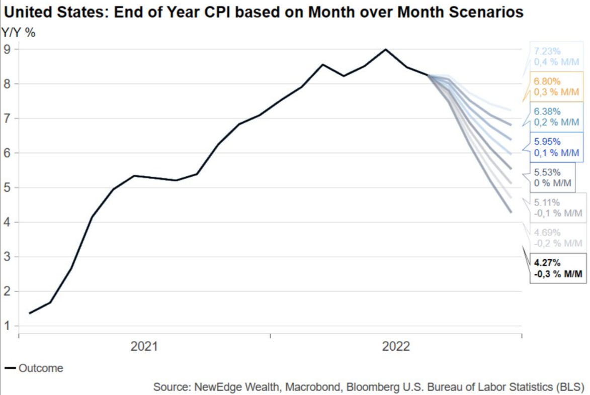 Lo cierto es que lo muy probable es que en los próximos pocos meses la inflación empiece a declinar, ya que por el efecto base (elevada inflación anterior), incluso con lecturas intermensuales elevadas, la inflación se moderaría como muestra el siguiente gráfico bajo distintos escenarios.