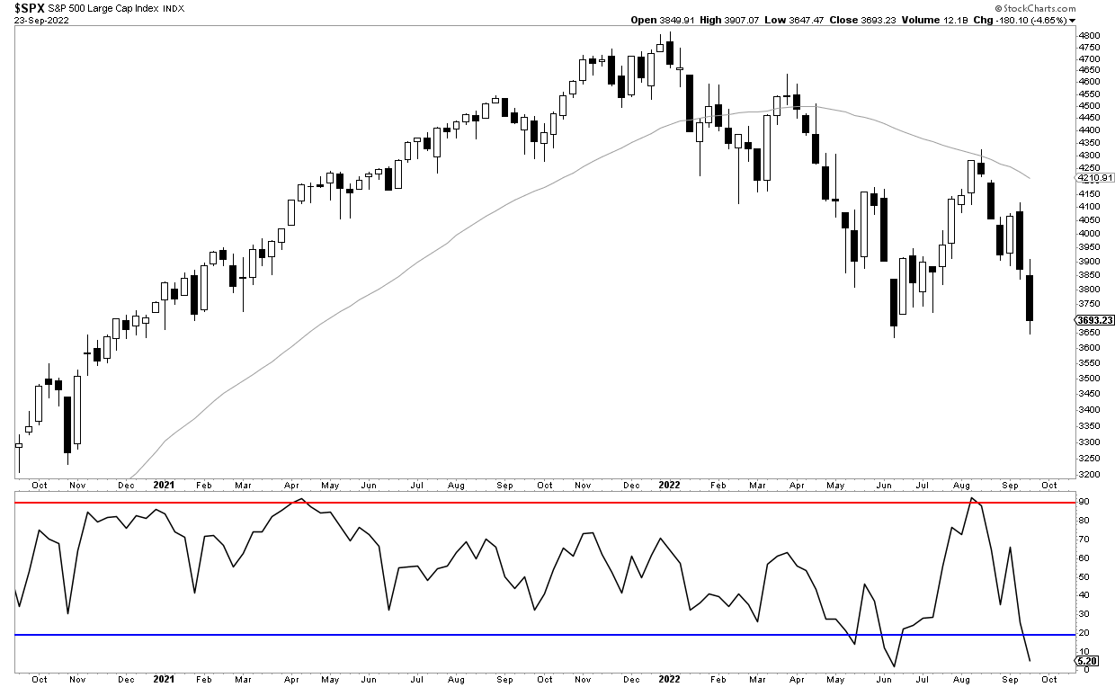 Y lo que hemos visto en esta semana tan negativa en todos los mercados y donde el S&P 500 ha perdido un -4,65%, es que el indicador de amplitud ha vuelto a caer por debajo del 20% hasta registrar una lectura del 5,20%.