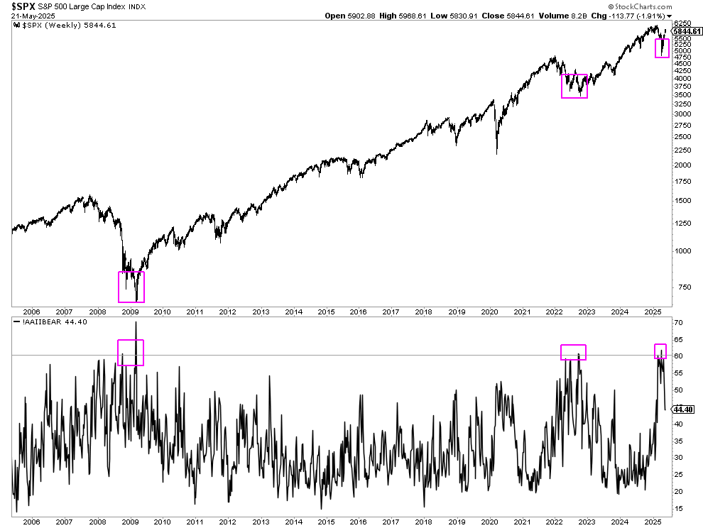 El pesimismo sobre las perspectivas bursátiles a 6 meses ha alcanzado un nivel extremo en la encuesta de American Investors, con registros de más de un 60% de bajistas, lectura que, por sorprendente que pueda parecer, sólo se vieron al final del moderado mercado bajista de 2022 y al final del brutal mercado bajista de 2008.