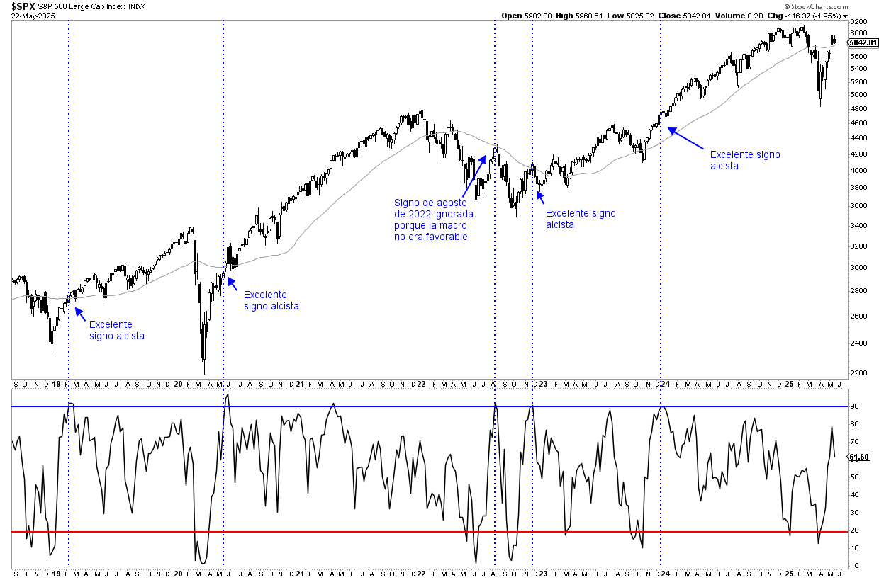 Mi señal de cautela táctica cumple dos meses y medio y aún sigue vigente (análisis aquí), dado que la amplitud o comportamiento general del mercado, todavía no se ha recuperado. No obstante, como he señalado todas estas semanas, mi postura era y es de cautela pero no de ser bajistas, ya que no se cumplen los elementos suficientes. El ser bajista (o alternativamente la "recomendación" de reducir exposición para los inversores de largo plazo) es algo que se ha de reservar para momentos muy concretos y que son escasos a lo largo del tiempo.