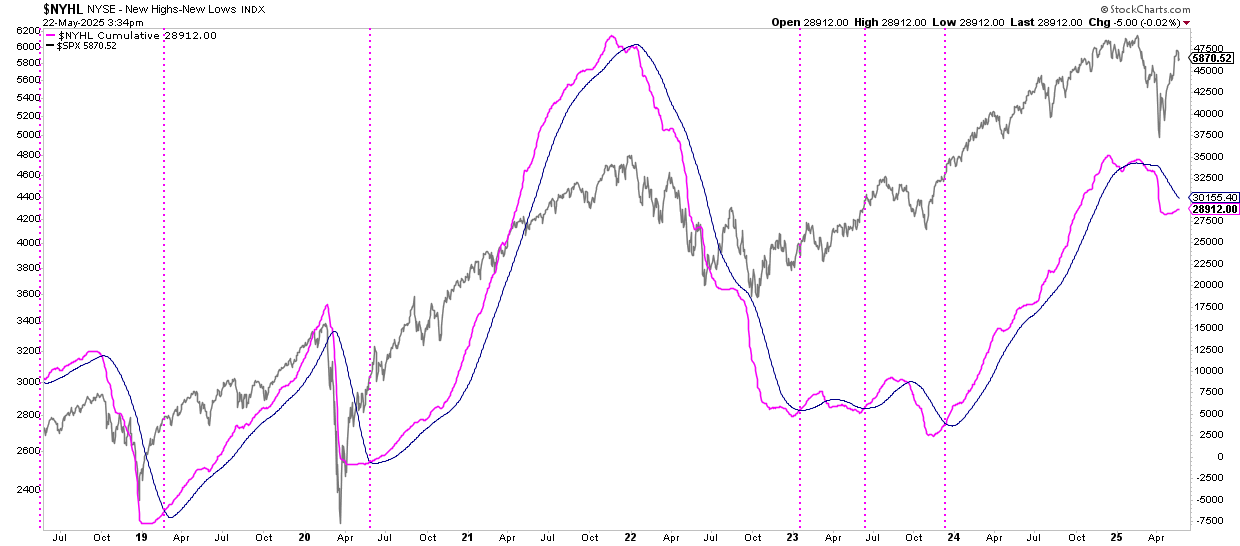 Pero aún no estamos ahí, como se puede comprobar por ejemplo en el indicador acumulado de nuevos máximos netos de compañías cotizadas en la bolsa de Nueva York (siguiente gráfico). Si bien la señal positiva parece acercarse en el tiempo, lo cierto es que, a día de hoy, no tengo tampoco confirmación del avance de la amplitud según este indicador.