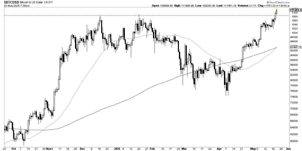 Bitcoin se encuentra estos días rompiendo al alza su máximo histórico en enero de este año, encontrándose en los momentos en los que escribo esta nota de mercado en los 111.454 puntos.