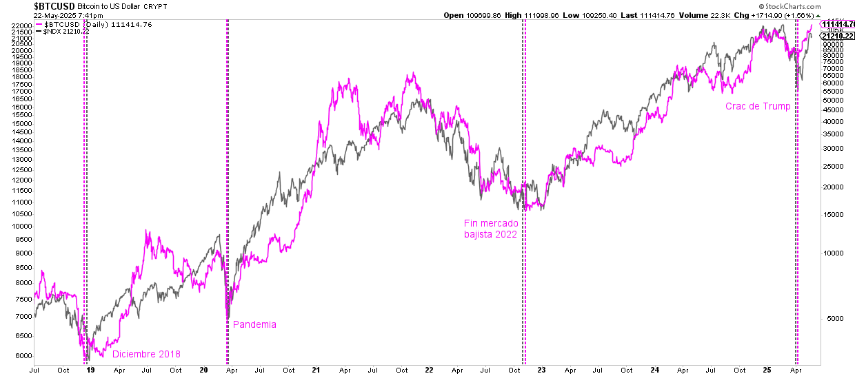 Si observamos las cosas con la amplitud suficiente, Bitcoin sigue siendo un activo de riesgo y de ahí la extrema coincidencia de las tendencias del mismo con el Nasdaq y en especial de los puntos o fases de capitulación de ambos activos. Esta vez tampoco ha sido diferente con respecto al "crac de Trump".