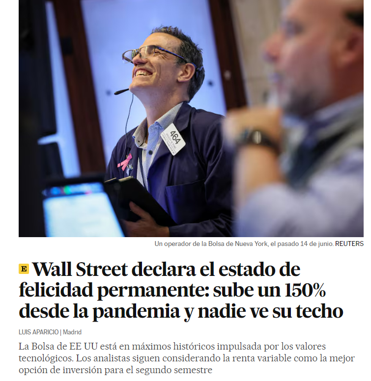 El sentimiento bursátil empieza a ser de bastante optimismo. No sabría si decir de euforia (aunque diría que no), pero sí hemos empezado a ver noticias, opiniones y artículos bastante ridículos. Como este de el diario español El País del pasado fin de semana donde habla de "felicidad permanente".
