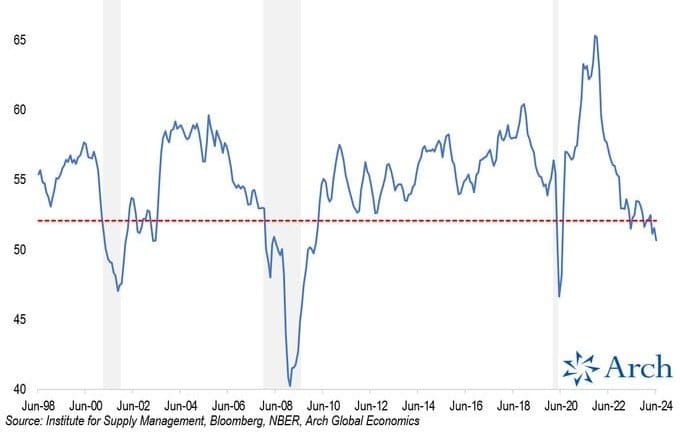 De hecho, lo que estamos observando por ejemplo este mismo mes, que tanto el indicador de actividad (ISM) del sector industrial como el del sector servicios estén en negativo (<50%), es un ejemplo más de lo extraño que es este ciclo.