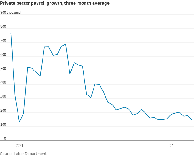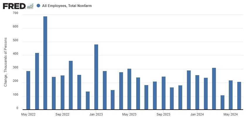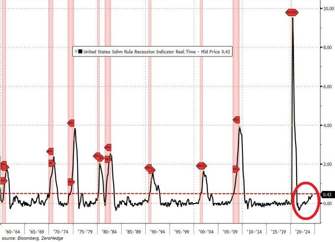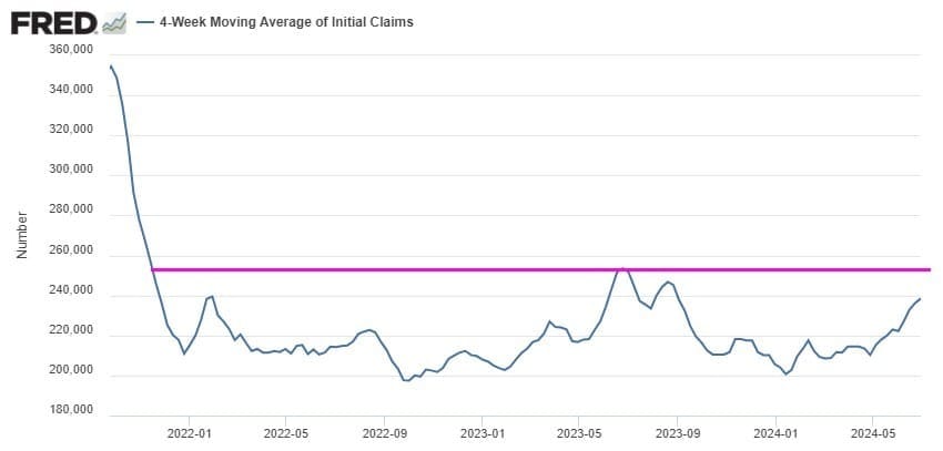 De hecho, la tasa de paro ya ha subido hasta el 4,1% desde el mínimo cíclico del 3,4% alcanzado en enero de 2023, haciendo que esté apunto de activarse el "indicador de recesión de Sahm", es cual es la observación de que cuando la media trimestral de la tasa de paro repunta más de 50 puntos básicos (0,5%) desde su mínimo anual, la economía probablemente esté en recesión. No es el caso aún, pero se está cerca (0,43%), lo cual es un signo de que el mercado laboral empieza a estar contra las cuerdas.