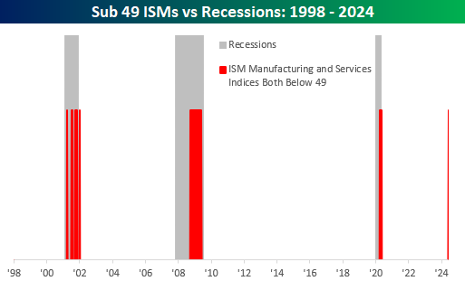 Como podemos ver en el siguiente gráfico, cuando ambos indicadores de actividad están por debajo del nivel del 50%, ha sido cuando históricamente se ha estado en recesión. Y, por supuesto, cuando en el pasado ha ocurrido esto, el mercado de acciones estaba cayendo a plomo. Pero no es así en esta ocasión, al menos no de momento.