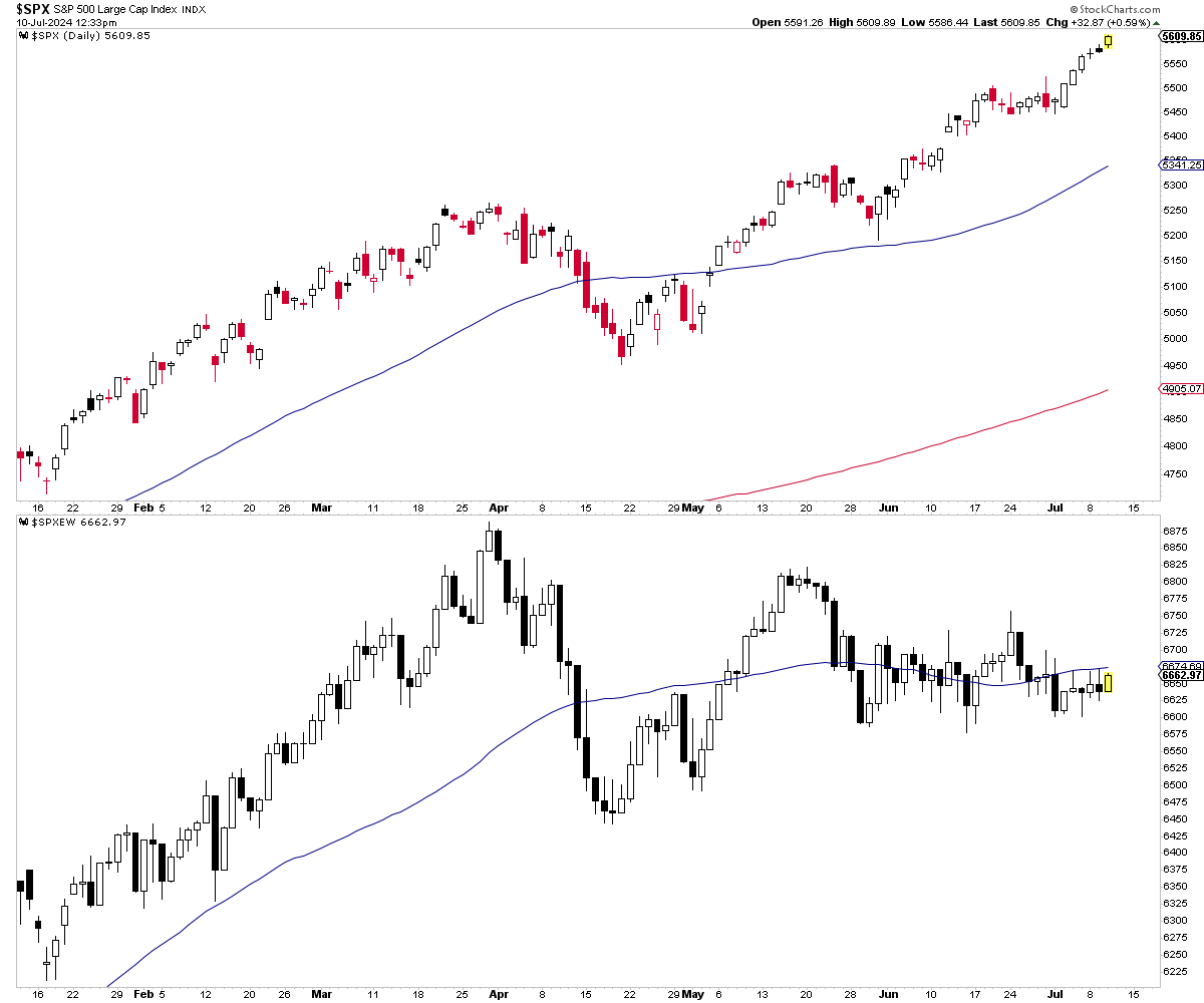 A nivel bursátil, esta apatía económica se refleja en que la amplitud o generalidad del mercado dejó de subir hace meses. Mientras el índice S&P 500 equiponderado, donde todos los componentes tienen el mismo peso, alcanzó su último máximo en el mes de abril, el S&P 500 y gracias a unos pocos valores (los "Magníficos 7") hoy mismo está batiendo un nuevo máximo histórico.