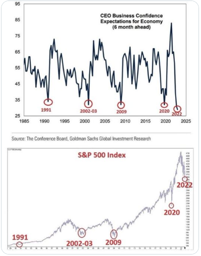 Y, en el mismo sentido, vemos que la confianza de los consejeros delegados se encuentra en un gran mínimo. Históricamente ese desplome de la confianza, si bien no te dice que va a hacer el mercado en pocas semanas, si que suele producirse cerca de mínimos relevantes del mercado de acciones en el medio y largo plazo.