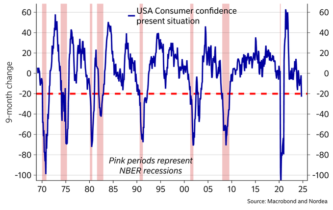 Entonces, ¿por qué ésta encuesta de sentimiento sí me preocupa a pesar de la salvedad hecha? Por dos razones. La primera porque el subíndice de situación actual o percepción actual de los consumidores (ese que en inglés es "present situation") ha entrado en barrena a un ritmo que sólo se ha observado en otras recesiones, no habiendo caído tanto ni en 2022 cuando todo el mundo hablaba de recesión, ni en los últimos 2 años cuando otros indicadores han entrado en alerta a pesar de que la economía seguía en pie.