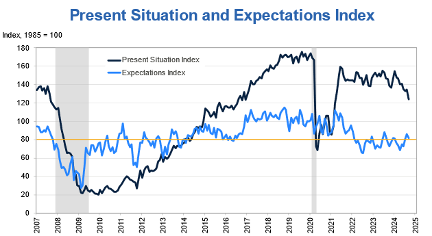 El índice general es el agregado tanto de las expectativas (por definición "futuras") de los consumidores, como de lo que relatan que están percibiendo en el momento actual y es aquí ("present situation") donde las cosas han empezado a declinar con fuerza, arqueando, como decía, la ceja de muchos, incluida la mía.