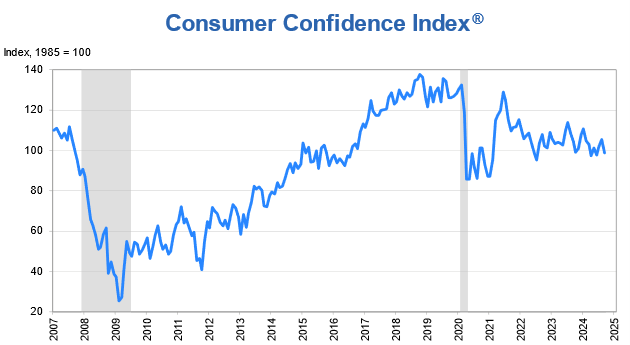 El dato en cuestión es el de confianza del consumidor calculado por The Conference Board, una institución dedicada desde hace décadas al estudio del ciclo económico. En concreto el índice de confianza del consumidor registra este mes una lectura de 98,7 puntos, declinando desde los 105,6 del mes anterior. Como se puede ver en el siguiente gráfico, a simple vista no parece que haya ocurrido nada notable con respecto a los dos últimos años, donde el índice ha estado fluctuando alrededor de estos niveles. Pero es que el problema está en los detalles de dicha encuesta a los consumidores.