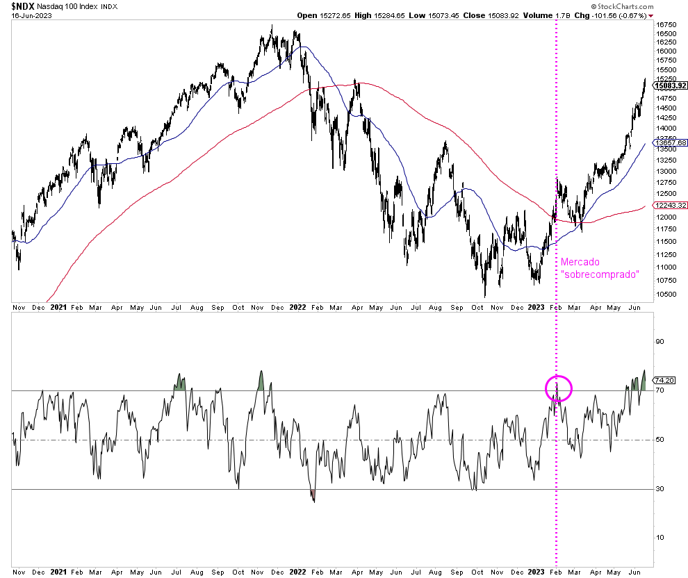 En un mercado alcista lo que ocurre con los puntos de sobreventa (o de sobre extensión alcista), es que suelen ser o completamente ignorados por el mercado o, más típicamente, crean una pausa temporal en las subidas con algún tipo de corrección. Incluso el Nasdaq del gráfico anterior corrigió 1.000 puntos entre febrero y marzo de este año, antes de volver a subir otros 3.000 puntos hasta los 15.000 actuales.
