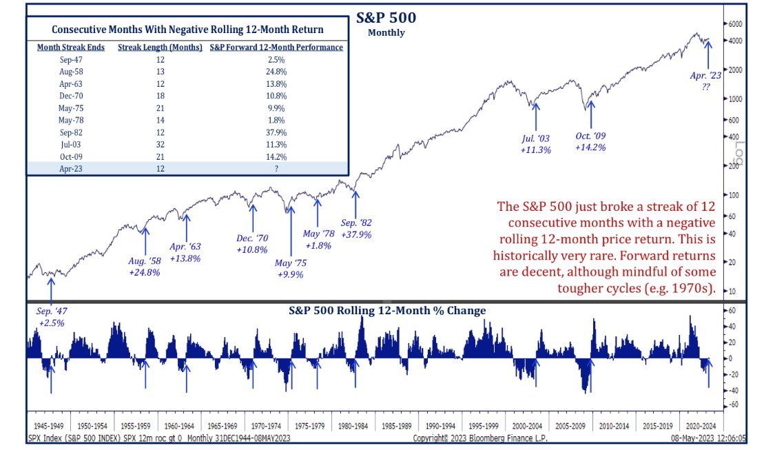 Por lo demás, seguimos viendo señales clásicas de los mercados alcistas. La última es que cuando tras 12 meses o más en rentabilidades interanuales negativas, el mercado pasa a tener rentabilidades interanuales positivas, es que efectivamente se suele estar en un mercado alcista, al menos de medio plazo, tal y como podemos ver en el siguiente gráfico.