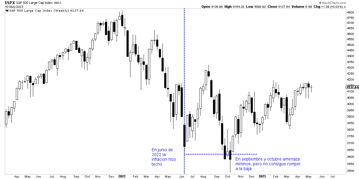 Así, en junio de 2022 el mercado intentó formar un suelo justo cuando la inflación hacía techo (dato de inflación que se conoció en julio de 2022), para luego formar un clásico "retest" de mínimos en octubre del mismo año.