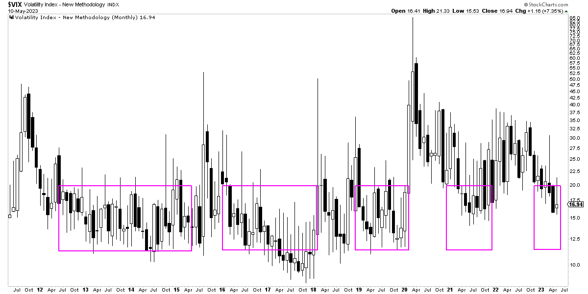Coherente con esta situación de mercado alcista más calmado que la fase previa, tenemos a un VIX, el llamado índice del miedo, que ha empezado a cotizar por debajo de 20, algo clásico en los mercados alcistas confirmados.