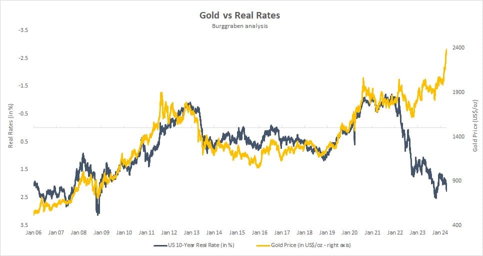 No tiene por qué ser necesariamente algo tan dramático como aquello, pero sí que es probable que esté ocurriendo algo de enorme magnitud, de tanta magnitud que, como expliqué el mes pasado, ha roto la estrecha relación que reinaba entre los metales preciosos y los tipos de interés reales en Occidente desde que el presidente Nixon canceló la convertibilidad del oro con el dólar estadounidense.
