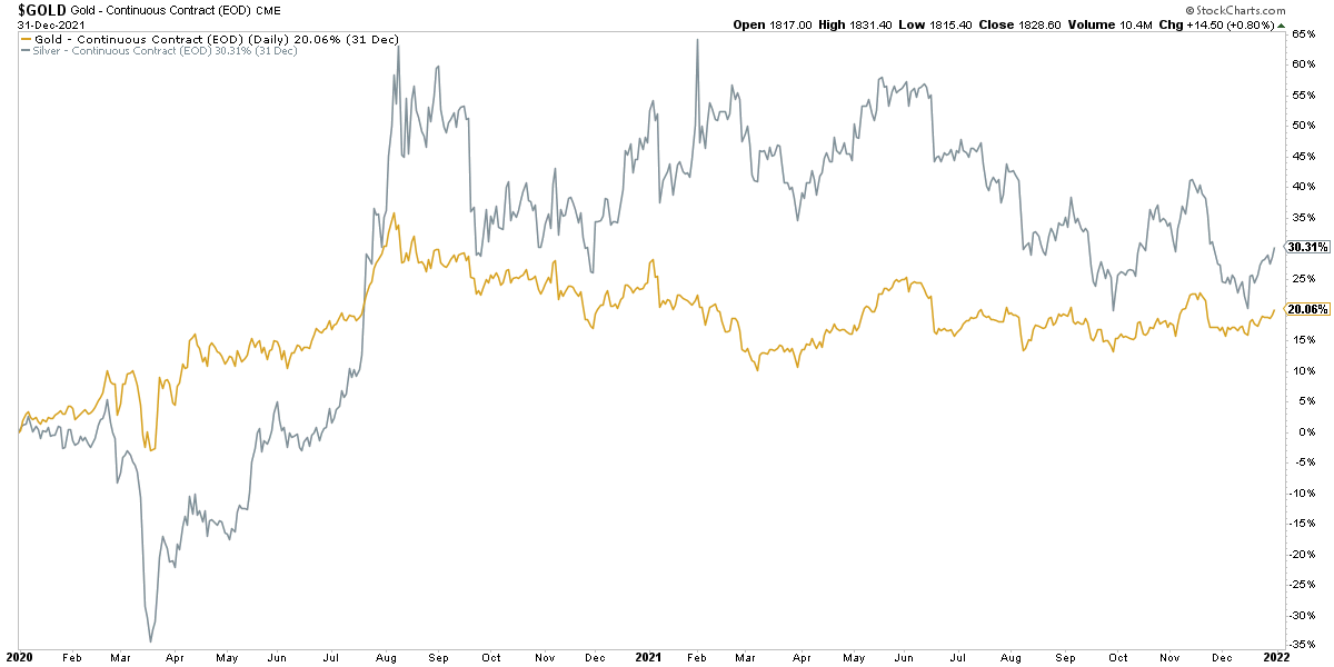 Luego, a continuación, ambos activos subieron como la espuma gracias a la drástica bajada de los tipos de interés reales. Y donde el Oro se apreció hasta un +35% para el mes de agosto de 2020, la Plata mostró un espectacular rally del 111% desde mínimos, para llegar apreciarse hasta casi un +65% en los máximos del año.