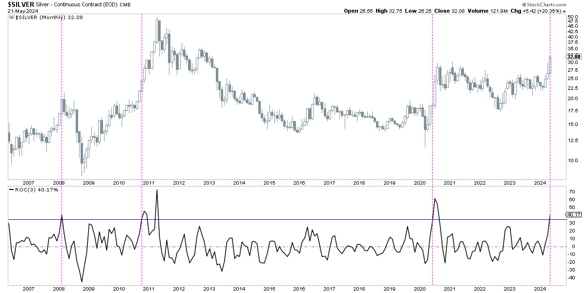 Ahora bien, si bien la Plata no me interesa especialmente por su comparación con el Oro, sí hay lecturas interesantes que podemos extraer de lo que está ocurriendo ahora mismo en este mercado. Sólo en este mes de mayo se está apreciando más de un +20% con respecto a abril, una magnitud que es enorme incluso para un activo tan volátil como éste.