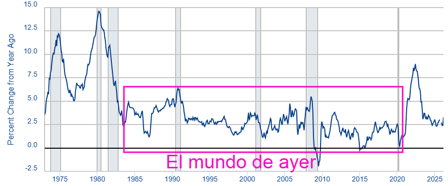 Es decir, desde que el presidente de la Reserva Federal por aquel entonces, Paul Volcker, se viera obligado a subir los tipos de interés oficiales a niveles récord cuando la inflación estadounidense alcanzó el 15%, hasta que después de unas tres décadas de moderación en los precios y en las cuentas públicas, todo terminó en el año 2021 cuando una pandemia y unos déficits disparatados cambiaron las reglas del juego "para siempre", fecha en la que el mundo que conocíamos dejó de existir.