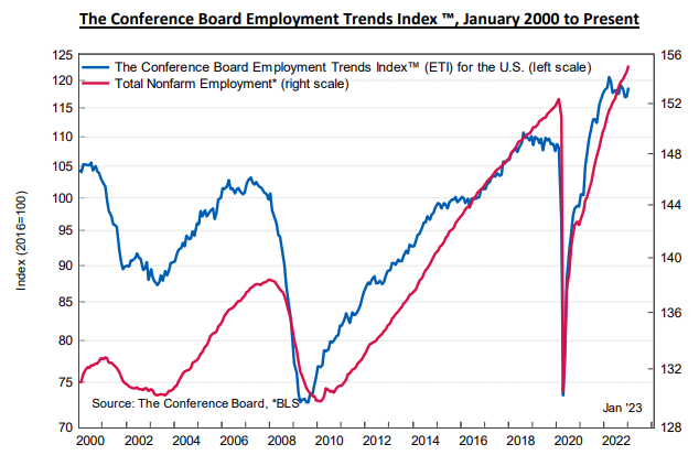 El mes pasado el número de vacantes sorprendió al alza hasta las 11.012.000 (algo negativo por inflacionario), quebrando la tendencia bajista que venía formando desde marzo de 2022 y que se observa a simple vista en el anterior gráfico.