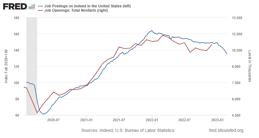 Si comparamos los datos de empleos ofertados en el portal de empleo Indeed y de los cuales ya tenemos datos, con el oficial -y más retrasado- de vacantes, lo más normal sería que las vacantes sin cubrir se reduzcan, lo cual sería positivo para el mercado de acciones.