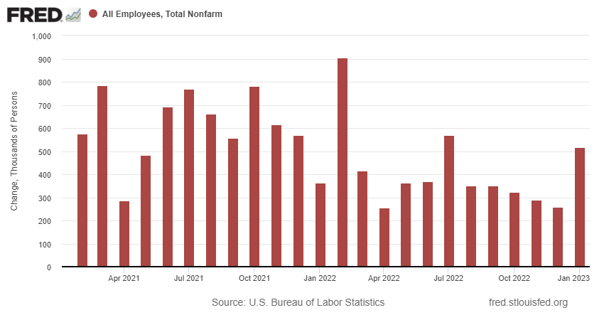 El mes pasado el empleo mostró que en enero se crearon 517.000 puestos de trabajo en EE.UU., una cifra muy por encima de la tendencia mostrada durante los meses anteriores y muy por encima de la expectativa media de los economistas, que era de tan sólo 185.000 nuevos puestos.
