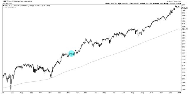 Los directivos que vendieron acciones durante enero de 2017, podrían haber aumentado significativamente su patrimonio en poco menos de doce meses, simplemente con haber mantenido sus inversiones un poco más. El siguiente gráfico del S&P 500 muestra el momento en el que se produjo el pico del ratio de ventas/compras de los directivos.