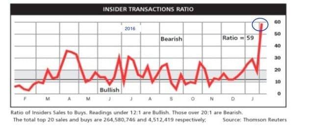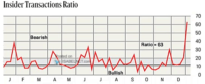De hecho, de forma agregada, durante los últimos días se ha producido un pico de venta de acciones por parte de los directivos de las cotizadas en Estados Unidos, tal como muestra el ratio de ventas / compras de estos directivos y que durante la última semana se ha disparado sobre 60. Esto, según la información provista por el creador del gráfico, sería extremadamente bajista, ya que "lecturas mayores a 20 son bajistas".
