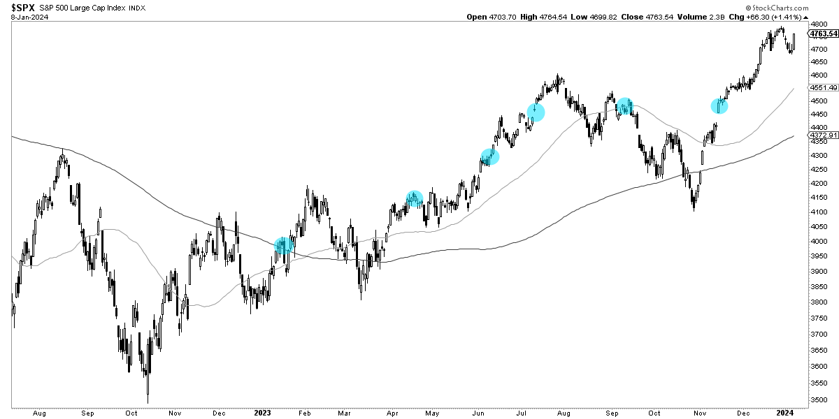 En el siguiente gráfico del S&P 500 señalo los momentos de esos picos. No solo no anticiparon correcciones por lo general, sino que el timing de los directivos fue horroroso. Podrían haber sido más ricos aplazando sus ventas un poco más de tiempo.