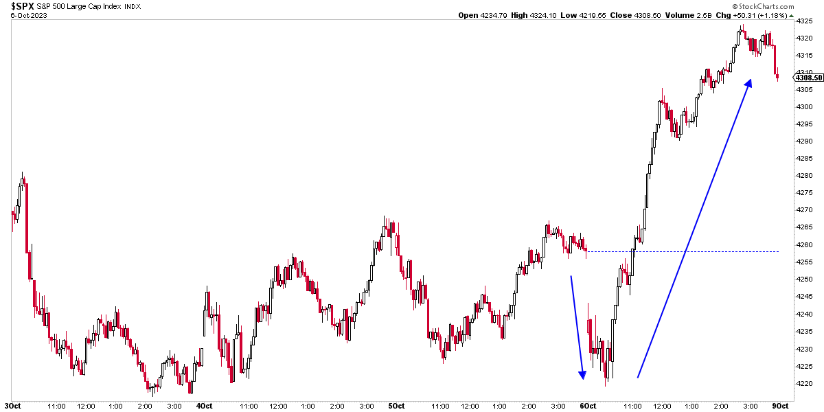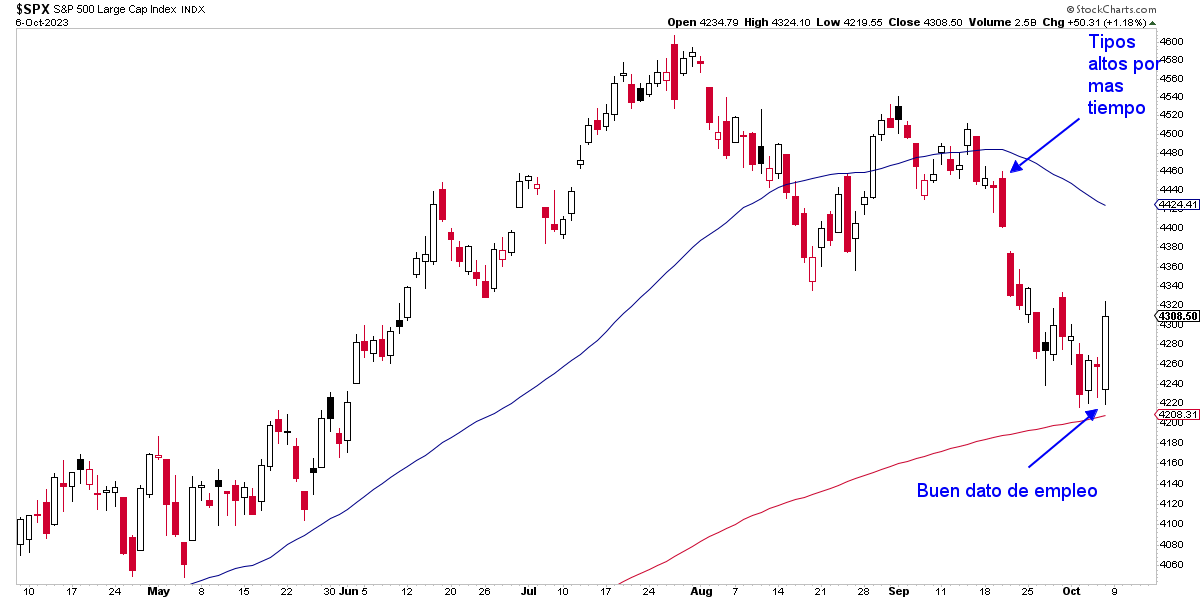 El clímax de esta dinámica -de nuevo, de muy corto plazo- se alcanzó el pasado viernes, cuando se publicó el dato oficial de empleo. Donde se esperaba una creación de 170.000 puestos de trabajo, el dato mostró una sorpresa bastante positiva con una creación de casi el doble de puesto de trabajo (336.000). ¿Y cuál fue la primera reacción del mercado a tan buena creación de empleo? Declinar más de un 1% en un claro contexto de "buenas noticias = malas noticias".