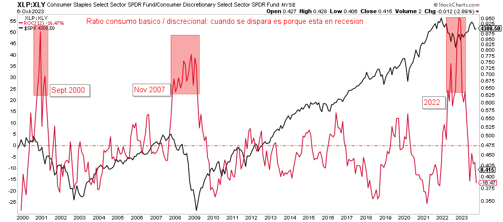 Esto es muy fácil de determinar. Sólo hay que ver como reacciona el mercado a las diferentes noticias macro. Pero también se puede determinar de otras maneras. Por ejemplo, el ratio del sector de consumo básico (piensa en papel higiénico) Vs. el sector de consumo discrecional (piensa en un videojuego) se eleva con energía cuando el mercado cotiza recesión económica, porque la gente en recesión compra menos videojuegos pero utiliza la misma cantidad de papel higiénico.