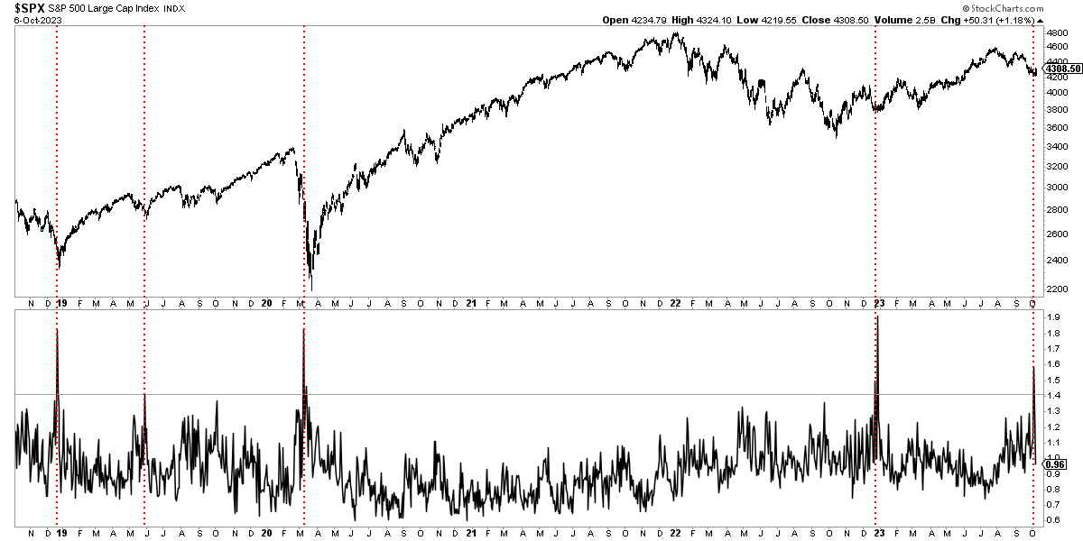 Si miramos algunos datos es lógico que pueda ser así. La semana pasada se alcanzó un punto extremo de pesimismo en el ratio de Put/Call (fuente), mostrando que los operadores salieron corriendo a buscar protección contra las caídas, algo que típicamente se da cerca de suelos del mercado (de nuevo, en el corto plazo, tendencia aparte).
