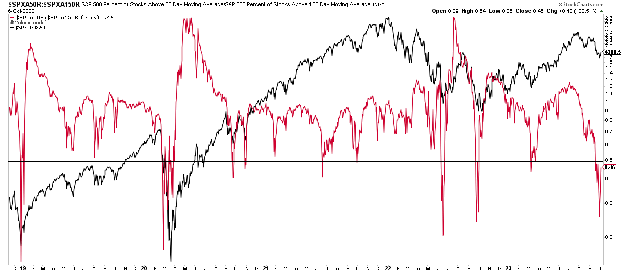 Este probable nivel de sobreventa desde el que es fácil de rebotar, lo confirma también el ratio 50/150 (fuente) que desde hace muchos años utilizo para entender cuándo se dan estos puntos extremos de corto plazo. Básicamente lo que este ratio refleja, es cuando la amplitud de mercado ha declinado "demasiado".