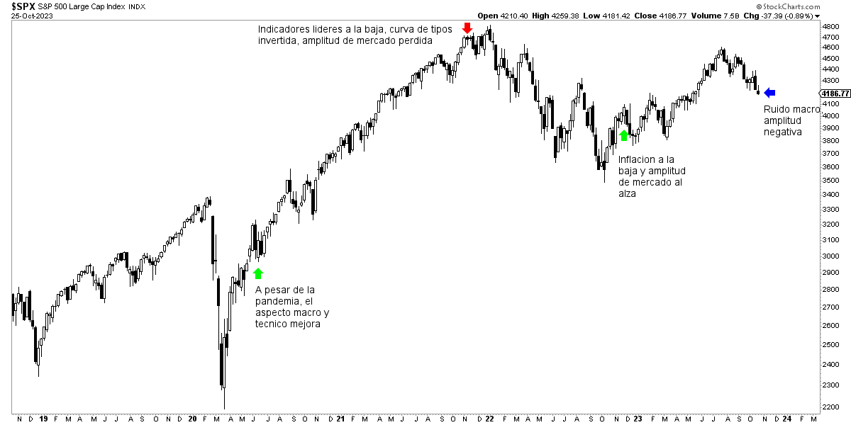 Pero, a la vez, los argumentos bajistas macroeconómicos actuales son importantes y no se pueden ignorar. Múltiples indicadores líderes señalando recesión, tipos de interés que siguen repuntando y varios elementos de la economía que siguen deteriorándose. En fin, desde un punto de vista macro no sólo no es un momento de falta de claridad, sino que los argumentos del lado bajista son potentes y respetables.