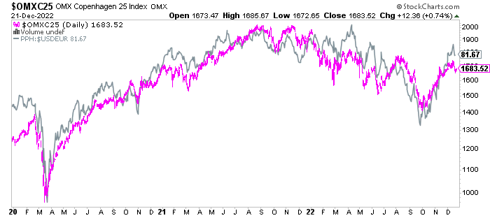 Por ejemplo, en el índice OMXC25 de Dinamarca, el sector salud (especialmente farmaceútico) tiene un peso del 36,83%. Con ello no es de extrañar que el índice danés se comporte exactamente con cualquier ETF del subsector farmacéutico en Estados Unidos, una vez que se tienen en cuenta los diferenciales de tipos de cambio.
