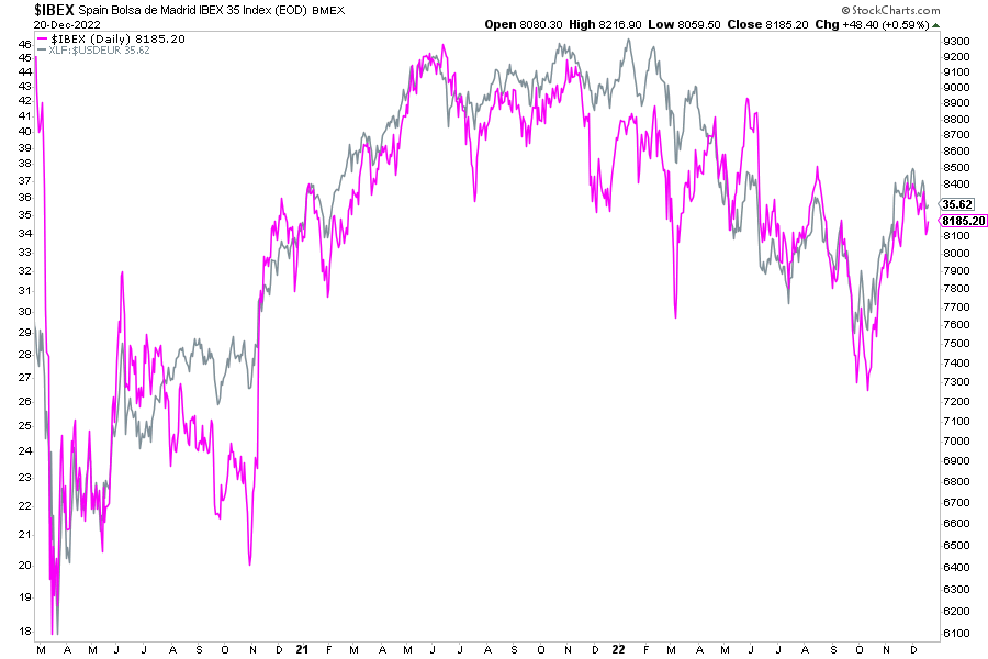 Tanto es así que al final el Ibex 35 solo se comporta como un ETF del sector financiero en EE.UU. una vez que se ajusta por el tipo de cambio.