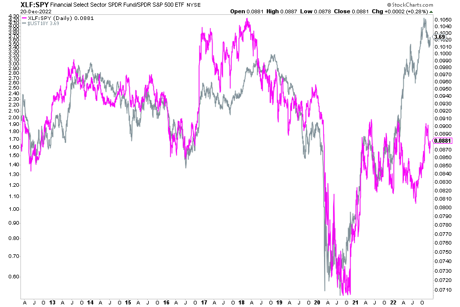No es lo mismo endeudarse al 0% para prestar al 2,5%, que endeudarse al 1% para prestar al 5%. Por ello, el ratio sector financiero Vs. índice general se mueve al ritmo de los tipos de interés.